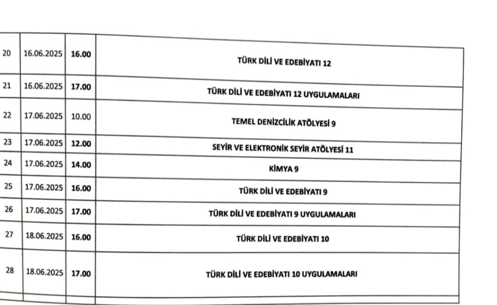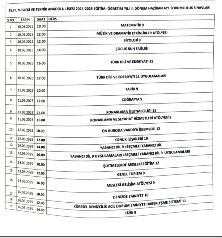 2024-2025 EĞİTİM- ÖĞRETİM YILI HAZİRAN AYI SORUMLULUK SINAV TAKVİMİDİR. ZAMANINDA SINAV YERİNİZDE BULUNUNUZ.